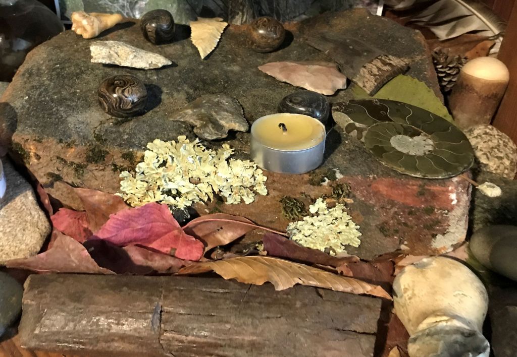 The large, flat stone that makes the central “altar” of my shrine is from a massive wall on my family farm – a structure I consider sacred in its own right. A century or two ago it was a bridge or perhaps a mill dam. The lichen-spotted rock rests on a bed of leaves taken from the same location. A number of objects lie on or about the stone, each with its own history.