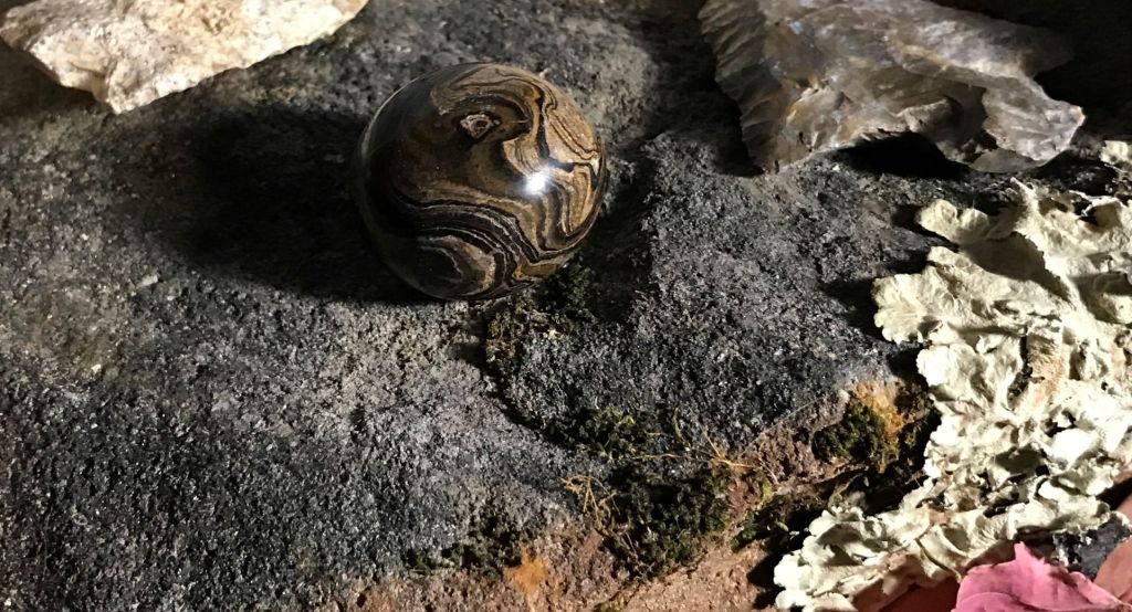 Remember the orders of magnitude between the flint and the spearheads, or between the mammoth and the dinosaur? Here we go again, as close as I can track life to the earth’s beginning. Four large, roughly rounded marbles with brown and black striations, represent those most ancient of times. These are stromatolites, the fossilized remains of the silty structures left by colonies of cyanobacteria. These microbes arose as far back as… are you ready?… 3.5 BILLION years ago. Their peak was 1.25 billion years ago, after which they declined as the world grew more hospitable to things that would graze on cyanobacteria. It should astound you to realize that these microbes persist in hostile environments today, so you can find active stromatolites in Australia and South and Central America. I would have loved to have found these specimens in my wanderings, but I bought them among some rock collections in Cambridge, Massachusetts.